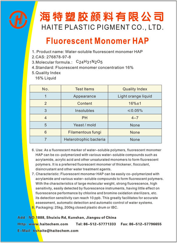 HAPNQ é líquido marrom com concentração de 16% e água de 84%. Quando usados no abastecimento de água industrial, os sinais fluorescentes do este polímeros etiquetados podem ser usados para determinar quantos polímeros etiquetados estam presente no abastecimento de água industrial.